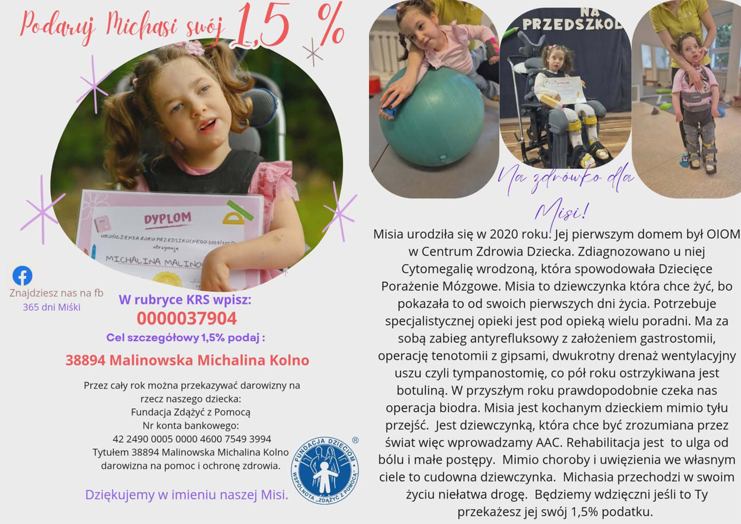 Wielkimi krokami przychodzi kolejny rok rozliczeń podatkowych. Pamiętaj, żeby zawsze komuś przekazać ten 1,5% podatku, bo to ważny cel. Michasia jest dziewczynką, która w tym roku będzie miała 6 lat. Nie chodzi i nie mówi, bo to najczęściej zadawane pytania. Nigdy nie wyzdrowieje.
