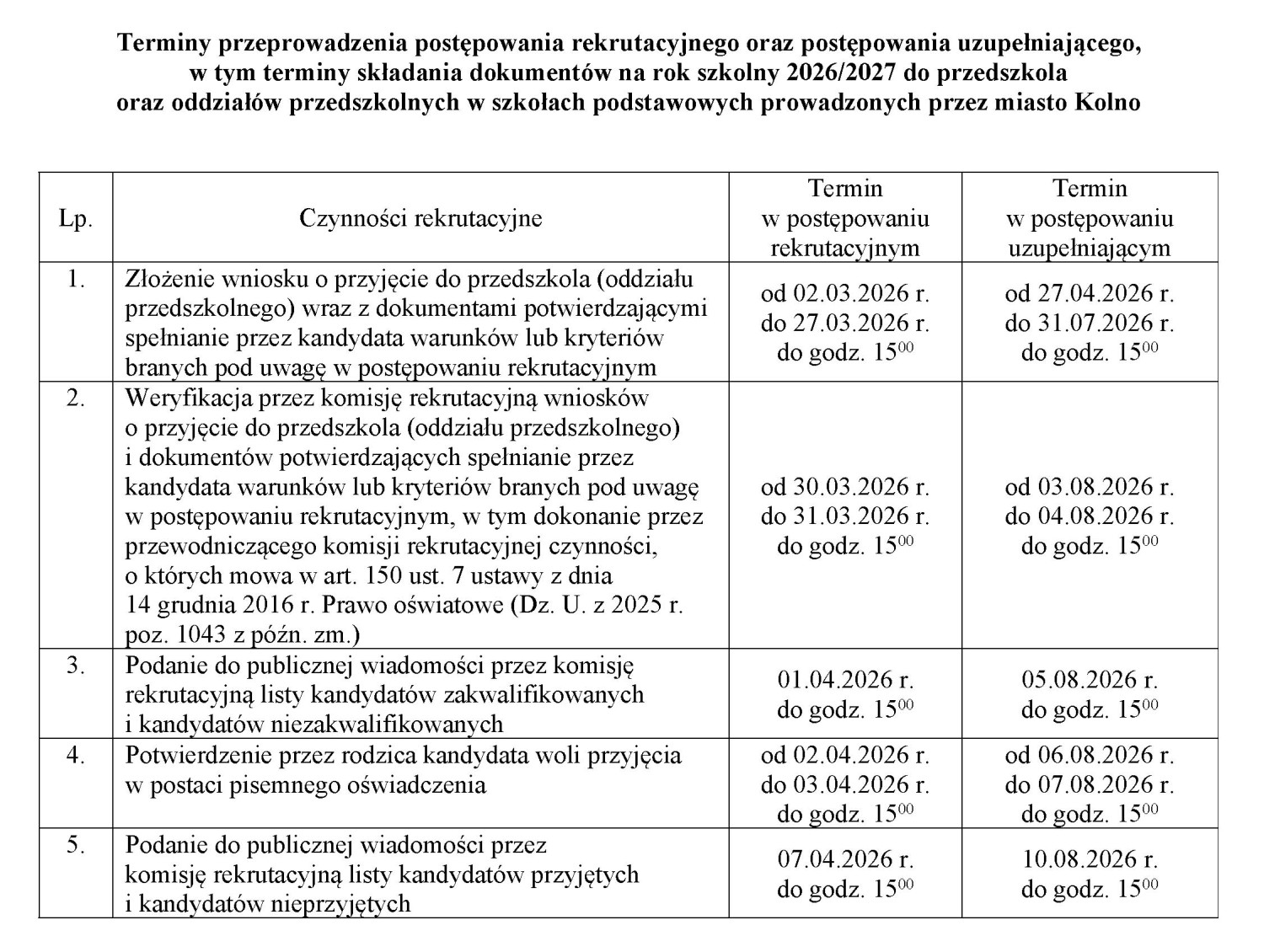 Władze miasta poinformowały o terminach przeprowadzenia postępowania rekrutacyjnego oraz postępowania uzupełniającego, w tym terminach składania dokumentów na rok szkolny 2026/2027 do przedszkola, oddziałów przedszkolnych w szkołach podstawowych oraz do klas pierwszych szkół podstawowych prowadzonych przez miasto Kolno.
