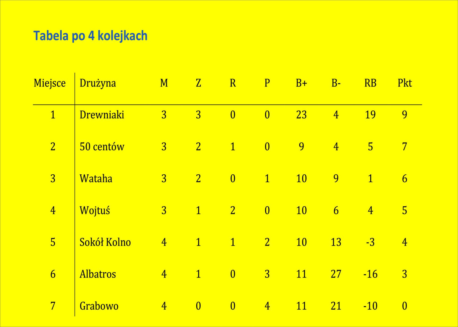 Po czterech kolejkach kolneńskiej ligi halowej w piłkę nożną na czele tabeli znajduje się drużyna Drewniaków. Najwięcej bramek zdobył do tej pory również zawodnik tej drużyny.