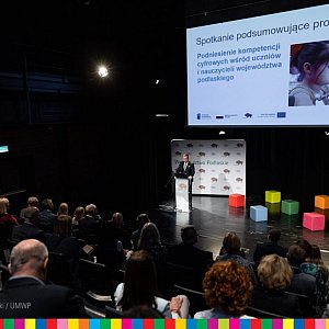 Mobilne pracownie komputerowe, kursy dla nauczycieli i dodatkowe zajęcia dla dzieci – to efekty projektu realizowanego przez Województwo Podlaskie, który został dofinansowany w kwocie 3,2 mln zł z funduszy europejskich. Spotkanie podsumowujące tę inicjatywę odbyło się we wtorek, 14 czerwca, w Uniwersyteckim Centrum Kultury w Białymstoku. Pamiątkowe grawertony, w ramach podziękowań za udział w projekcie, przedstawicielom lokalnych samorządów wręczył wicemarszałek Sebastian Łukaszewicz.