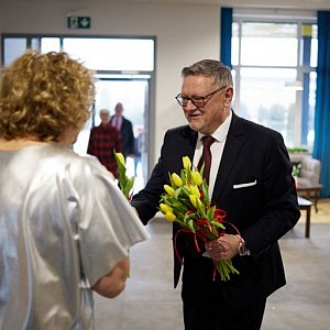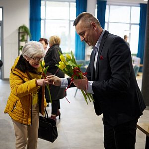 Tradycyjnie przed wejściem na salę widowiskową wszystkie panie zostały obdarowane kwiatami przez Burmistrza Miasta Kolno Andrzeja Dudę.