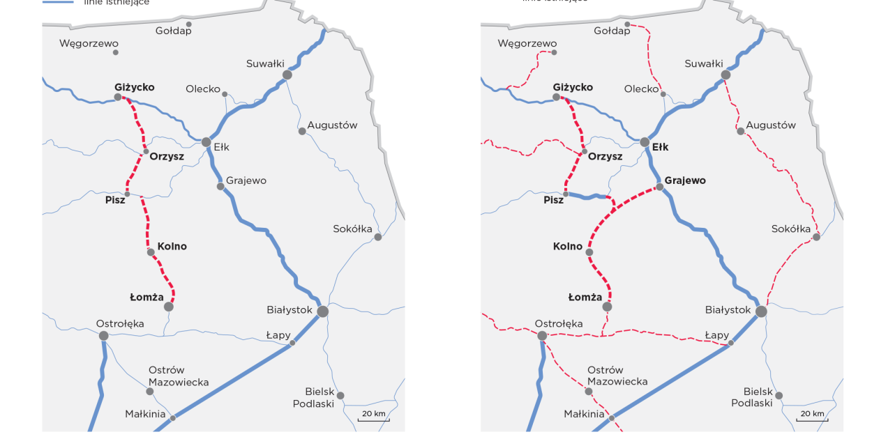 - Analizy i konsultacje (m.in. spotkania w Olsztynie i Białymstoku oraz wytyczne wojska i resortu obrony) wskazały, że korzystniejsze będzie poprowadzenie nowej linii w okolicach Kolna, z rozgałęzieniem do Grajewa (i dalej do Ełku). Dzięki temu liczba mieszkańców, którzy będą mogli skorzystać z pociągów na nowej trasie, może wzrosnąć nawet kilkukrotnie. Wcześniej prezentowane rozwiązania wykluczały możliwość skorzystania z linii przez ok. 60 tys. mieszkańców Ełku oraz 20 tys. mieszkańców Grajewa - czytamy na stronie internetowej Port Polska.