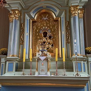 Konserwacja obrazów z ołtarza głównego ("Matka Boża Częstochowska i Ukrzyżowanie) oraz z ołtarzy bocznych (Chrzest Chrystusa i Św. Antoni) zakończona.