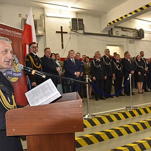Uroczysty apel rozpoczął się złożeniem meldunku przez dowódcę uroczystości mł. bryg. Mariusza Mieczkowskiego dla mł. bryg. Łukasza Chankowskiego, zastępcy podlaskiego komendanta wojewódzkiego PSP, który następnie dokonał powitania pododdziałów oraz pocztów sztandarowych.