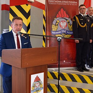 Następnie odbyło się przywitanie przybyłych na uroczystość gości przez komendanta powiatowego PSP w Kolnie st. bryg. Pawła Pupka, który podziękował podlaskiemu komendantowi wojewódzkiemu PSP oraz samorządowcom za dotychczasową współpracę, wsparcie finansowe i wkład w rozwój ochrony przeciwpożarowej na terenie powiatu kolneńskiego.