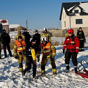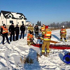 Na zamarzniętym zbiorniku wodnym w Chludniach odbyło się szkolenie strażaków Państwowej Powiatowej Straży Pożarnej w Kolnie, Ochotniczej Straży Pożarnej w Małym Płocku i policjantów kolneńskiej jednostki.