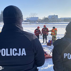 Wszystko po to, by skutecznie współdziałać w realnych sytuacjach zagrożenia życia i zdrowia. Pamiętajmy, że nie ma bezpiecznego lodu. Kilka minut spędzonych w zimnej wodzie, prowadzi do wyziębienia, utraty sił, przytomności i w konsekwencji - śmierci (fot. KPP Kolno)