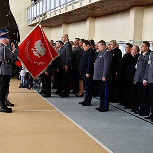 Rotę ślubowania od nowych funkcjonariuszy przyjęli uczestniczący w uroczystości Sekretarz Stanu w Ministerstwie Spraw Wewnętrznych i Administracji Jarosław Zieliński i Komendant Wojewódzki Policji w Białymstoku nadinspektor Daniel Kołnierowicz.