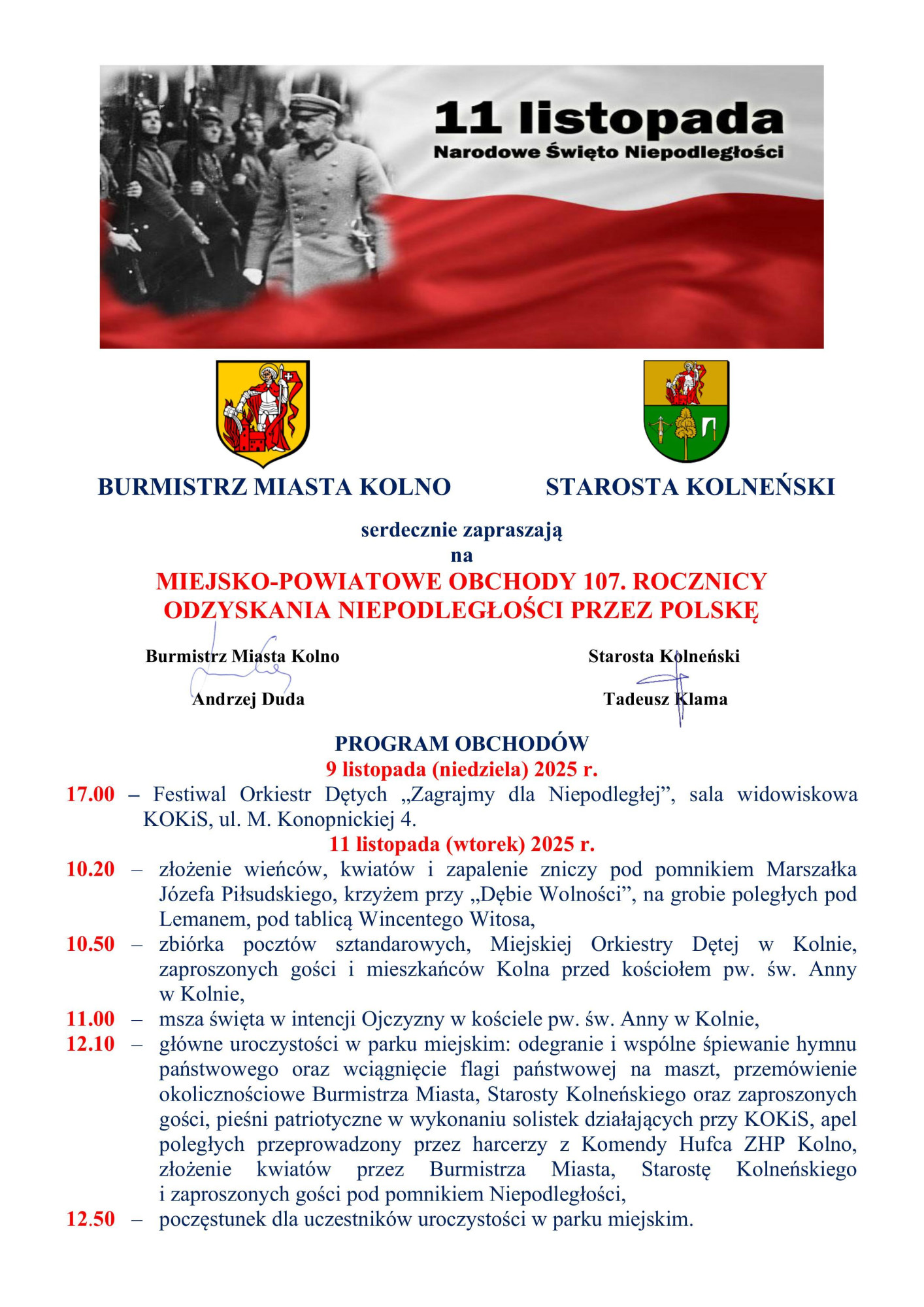 Burmistrz Miasta Kolno oraz Starosta Kolneński zapraszają mieszkańców miasta i powiatu na wspólne świętowanie 107. rocznicy odzyskania przez Polskę niepodległości.