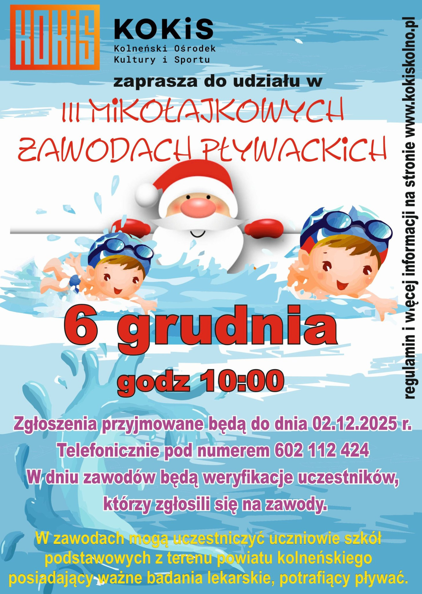Kolneński Ośrodek Kultury i Sportu organizuje 6 grudnia zawody pływackie dla uczniów szkół podstawowych z terenu powiatu kolneńskiego.