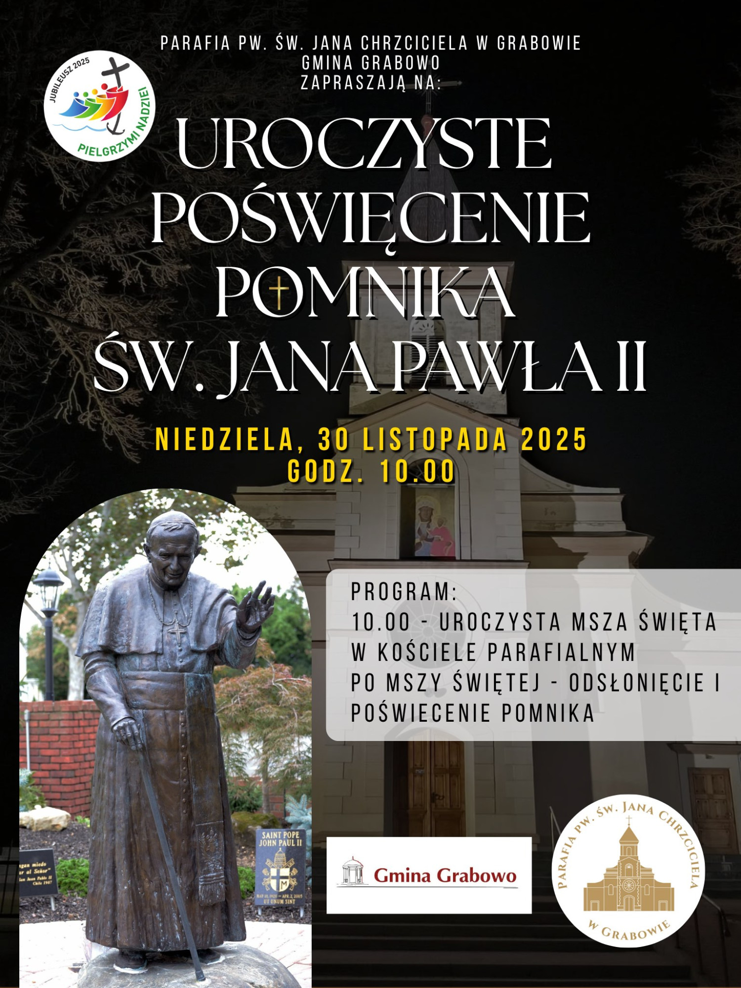 Serdecznie zapraszamy 30 listopada 2025 r. na uroczyste otwarcie i poświęcenie pomnika św. Jana Pawła II, które odbędzie się po Mszy Świętej o godz. 10.00.