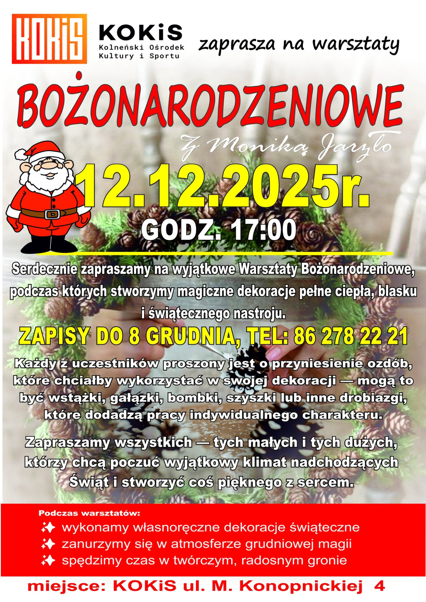Podczas warsztatów: wykonamy własnoręczne dekoracje świąteczne, zanurzymy się w atmosferze grudniowej magii, spędzimy czas w twórczym, radosnym gronie. Zapraszamy wszystkich — tych małych i tych dużych — którzy chcą poczuć wyjątkowy klimat nadchodzących Świąt i stworzyć coś pięknego z sercem. Do zobaczenia przy wspólnym stole pełnym kolorów, aromatów i inspiracji! - czytamy w komunikacie KOKiS.