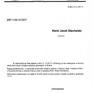 Składam skargę na Józefa Chodnickiego, podpisanego pod załączonym pismem I LO w Kolnie o znaku ZSP.1130.10.2017.