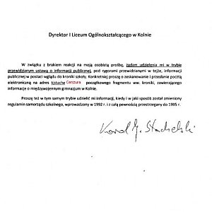 1. Żądałem zeskanowania i przesłania na moją pocztę elektroniczną początkowego fragmentu kroniki szkoły, zawierającego informacje o międzywojennym gimnazjum w Kolnie. W przesłanym mi piśmie stoi „nie odnaleziono w kronice szkoły informacji o międzywojennym gimnazjum w Kolnie”. A jednak po złożeniu przeze mnie skargi, 5 stycznia br. dostałem drogą e-mailową skany trzech pierwszych stron owej, z informacjami o szkole z okresu międzywojennego. Czy dyrektor podpisał pismo z nieprawdziwymi informacjami? Sam wykazał, że TAK.