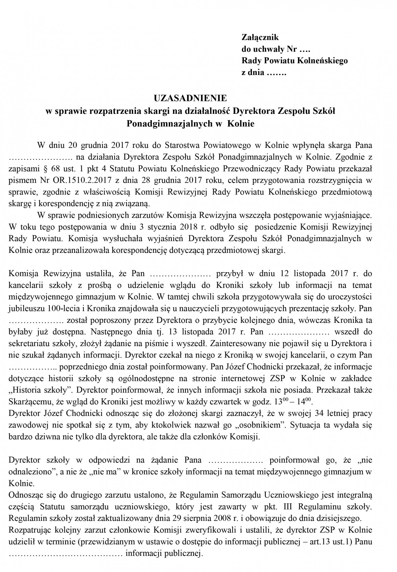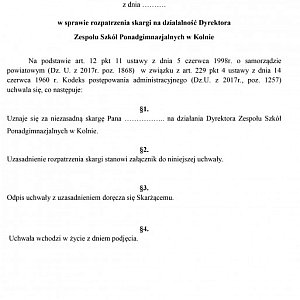 A jednak w zamieszczonym w Biuletynie Informacji Publicznej projekcie uchwały Rady Powiatu Kolneńskiego uznaje się skargę za niezasadną. Nie częściowo bezzasadną, ani że niezgodne z prawem działania dyrektora były uzasadnione okolicznościami. W całości niezasadną.