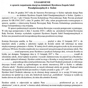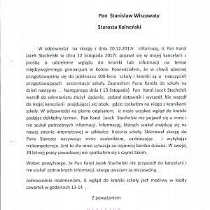 Ciekawym i symptomatycznym wydaje mi się zdanie zaczęte słowami: „Komisja Rewizyjna ustaliła, że Pan ... przybył w dniu 12 listopada 2017 r. do kancelarii szkoły”. Prosze popatrzeć w kalendarz - 12 listopada była niedziela! Już tyle wystarczy by stwierdzić, że wyjaśnienia złożone przez dyrektora Zespołu Szkół Ponadgimnazjalnych nie opierają się na prawdzie. W mojej skardze informuję, że na wgląd do kroniki umówiłem się z dyrektorem w dniu, w którym rozmawiałem o tym z Panem Starostą. Tego dnia wicestarosta był oddelegowany do Warszawy, więc z nim rozmawiałem o tym zdarzeniu kilka dni później. Komisja miała możliwość sprawdzenia tej daty, tak samo jak ja - to był 6 listopada (poniedziałek). Wniosek o udostępnienie informacji publicznej, wobec braku jakichkolwiek prób kontaktu (a wziął ode mnie kartkę z danymi kontaktowymi), w ostatnim dniu mojego pobytu w Kolnie, czyli w następny poniedziałek 13 listopada. Ten fakt nie powinien wpływać na meritum rozpatrywanej skargi, ale doskonale naświetla, czyjemu słowu w tym wypadku można ufać.
