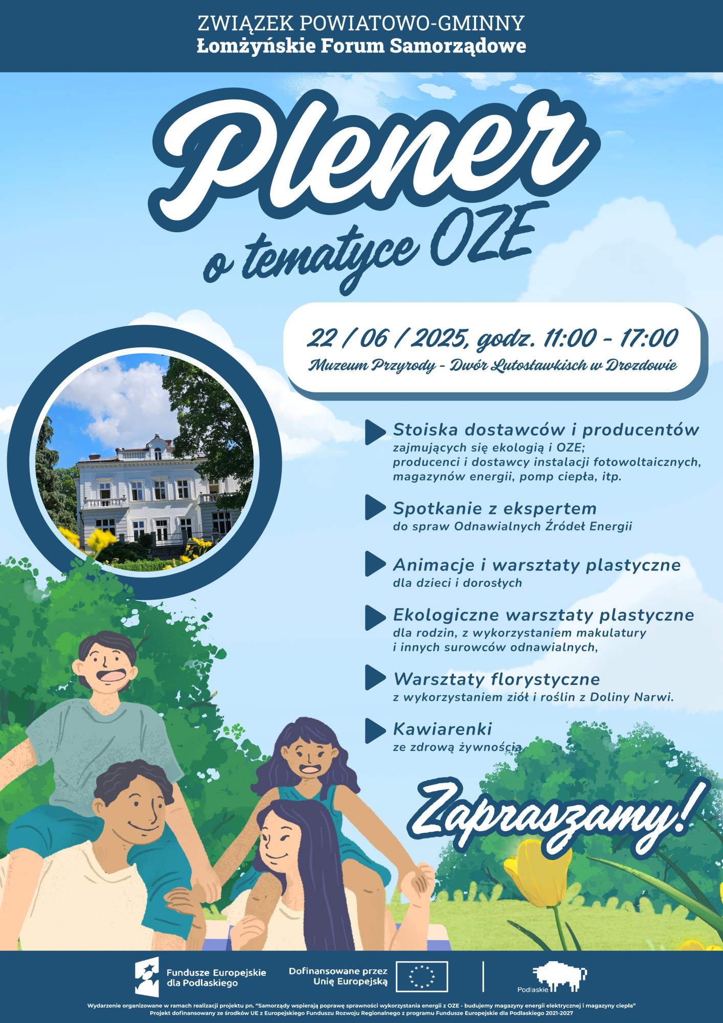 Plener o tematyce OZE odbędzie się w ramach realizacji projektu pn. "Samorządy wspierają poprawę sprawności wykorzystywania energii z OZE - budujemy magazyny energii elektrycznej i magazyny ciepła" współfinansowanego przez Unię Europejską. Będzie miał on formę ekologicznego festynu rodzinnego, który zagości na terenie Muzeum Przyrody w Drozdowie.