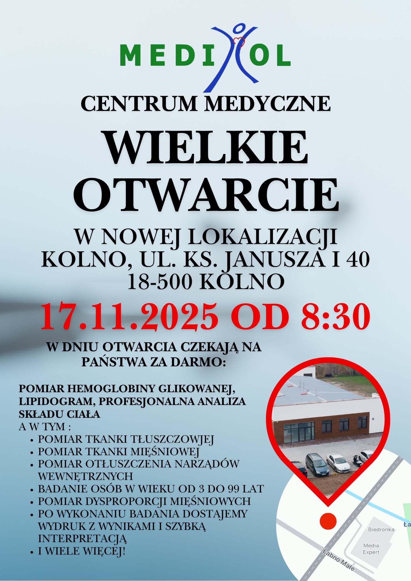 17 listopada 2025 r. od 8:30 zapraszamy do nowej lokalizacji Centrum Medycznego Medi-Kol – ul. ks. Janusza I 40, 18-500 Kolno.