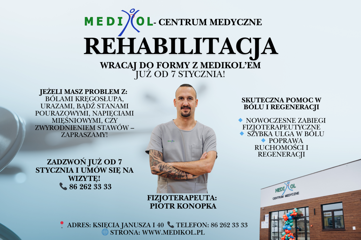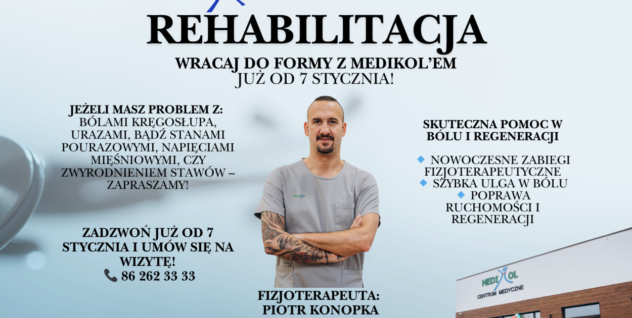 W MEDI-KOL – Centrum Medycznym wiemy, jak bardzo ból i ograniczenia ruchowe potrafią utrudnić codzienne funkcjonowanie. Dlatego od 7 stycznia oferujemy profesjonalną rehabilitację, której celem jest realna poprawa komfortu życia naszych pacjentów.