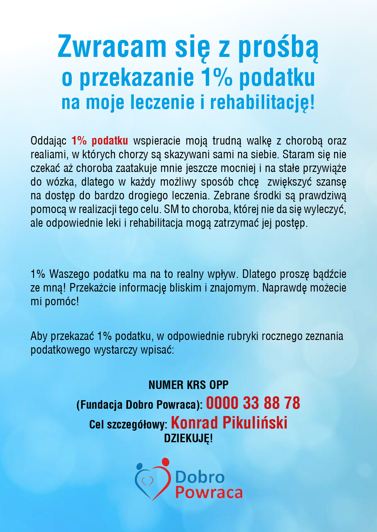 SM to choroba, której nie da się wyleczyć, ale odpowiednie leki i rehabilitacja mogą zatrzymać jej postęp. 1% Waszego podatku ma na to realny wpływ. Przekażcie informację bliskim i znajomym.