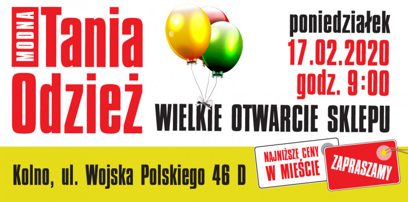 Już w najbliższy poniedziałek 17.01.2020 r. zapraszamy do Kolna na ul. Wojska Polskiego 46D na wielkie otwarcie sklepu z Modna Tanią Odzieżą.