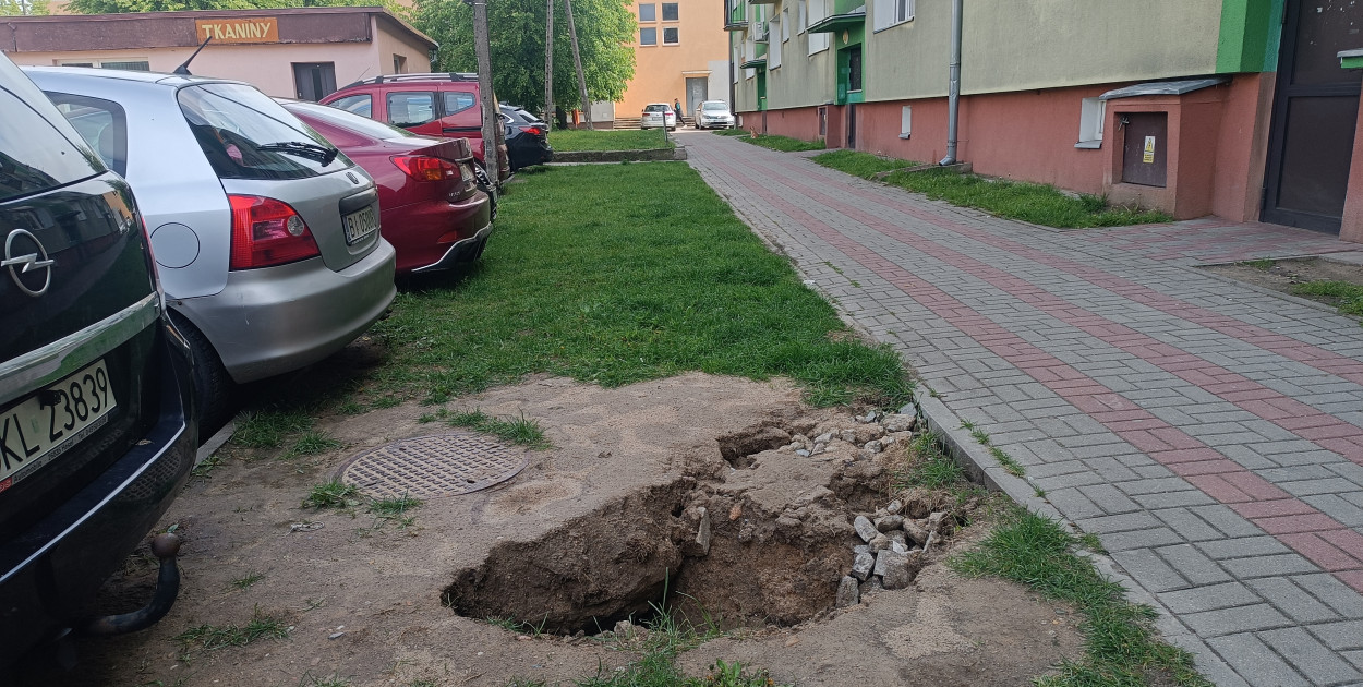 Chodzi o zapadniętą studzienkę przed blokiem przy ulicy 11 listopada. W tym przypadku dziura przy chodniku towarzyszy mieszkańcom co najmniej od dwóch tygodni.