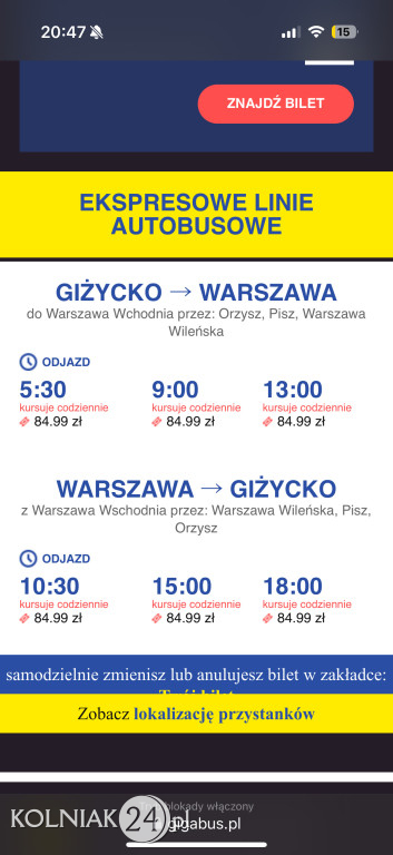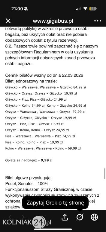 „ - Szanowna redakcjo, zwracam się z prośbą o zainteresowanie się sprawą, która dotyczy mieszkańców Kolna i osób korzystających z transportu na trasie Warszawa – Giżycko. Przewoźnik Giga Bus wprowadził podwyżkę cen biletów wyłącznie dla pasażerów podróżujących do Kolna – cena wzrosła z 64,99 zł do 69,99 zł, podczas gdy ceny na pozostałych odcinkach tej samej trasy pozostały bez zmian.
