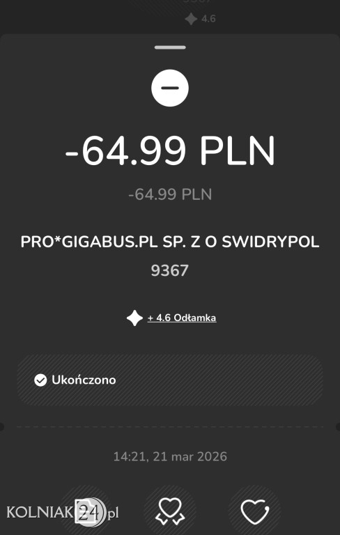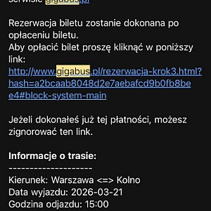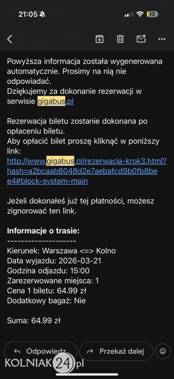 Czytelnik dodaje, że zgodnie z oficjalnym cennikiem przewoźnika obowiązującym od 22.03.2026 r. cena na trasie Kolno – Warszawa wynosi 69,99 zł.