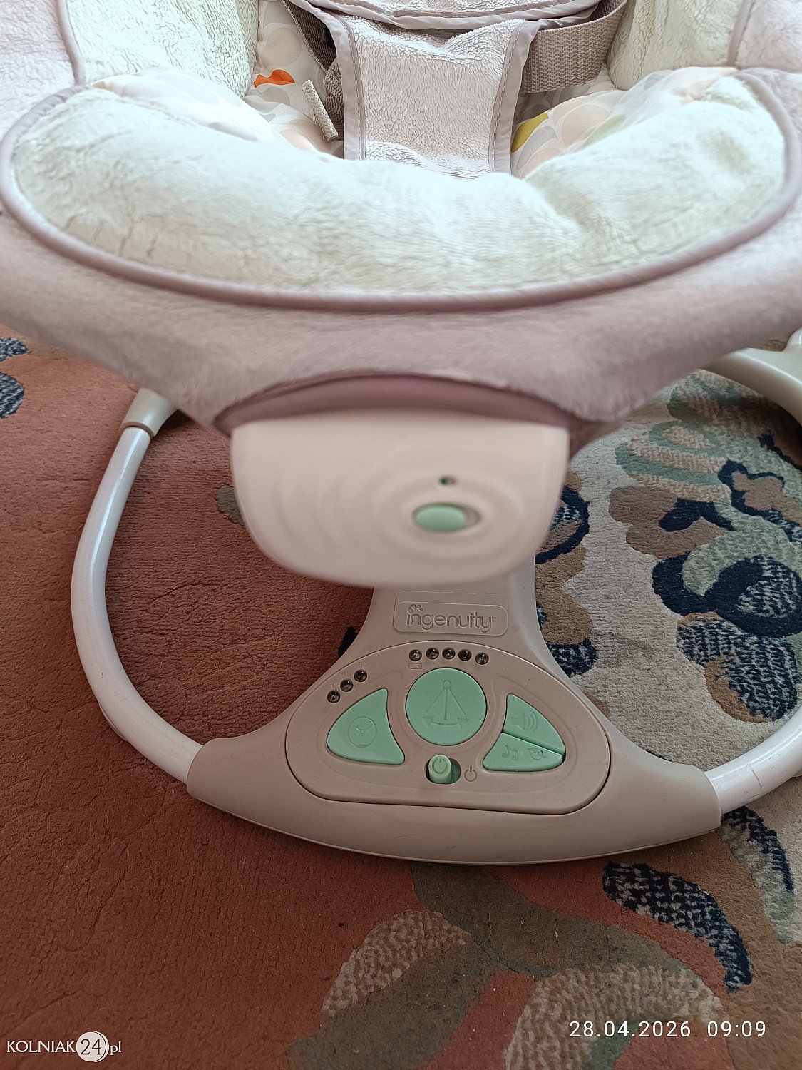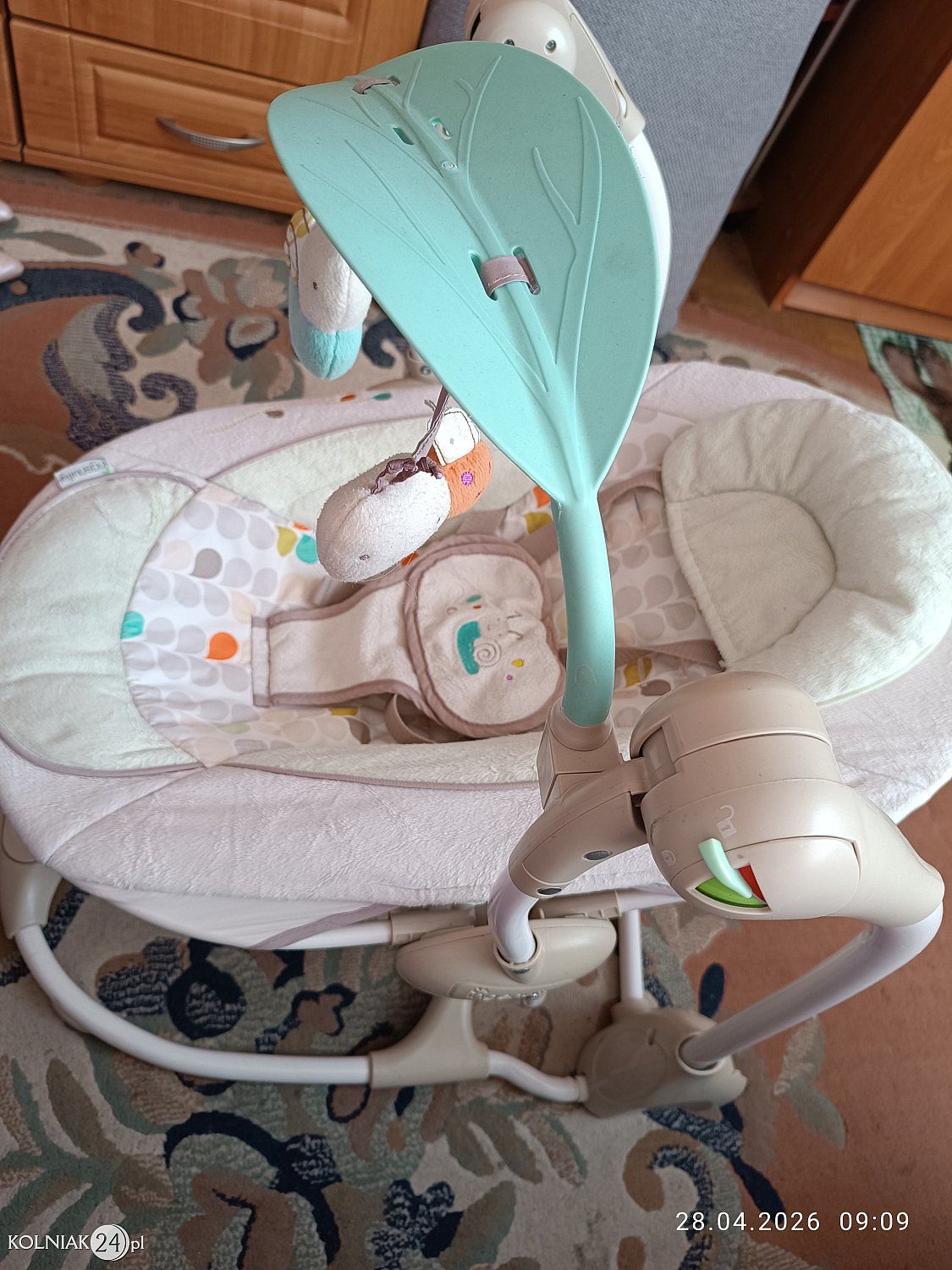ma 5 trybów mocy bujania, możliwość zablokowania bujania, może bujać się tak długo aż go nie wyłączymy lub włączyć timer który ma 3 tryby, są melodie i dźwięki natury które możemy włączać i wyłączać dowolnie, regulacja głośności. leżaczek posiada też wibracje jednak z tego właściwie nie korzystaliśmy, pałąk ze ślimaczkiem i biedronką.