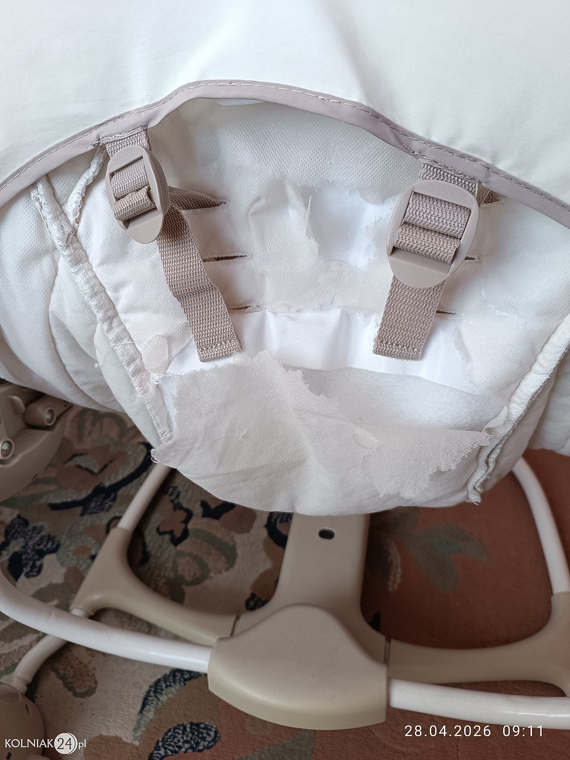Leżaczek poza opisanym mankamentem w bardzo dobrym stanie gdyż był używany doraźnie przez 6 miesięcy.